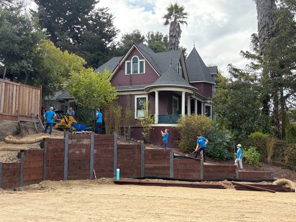 Things are buzzing at Blankenship Place! Over the past few weeks, homeowners, volunteers, and corporate partners have been hard at work raising the first structures on site. Together, we built a 70-foot retaining wall at the back of the lot and are now midway through a new fence along the property line.